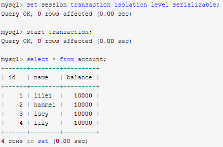 (1)打开一个客户端A,并设置当前事务模式为serializable,查询表account的初始值: