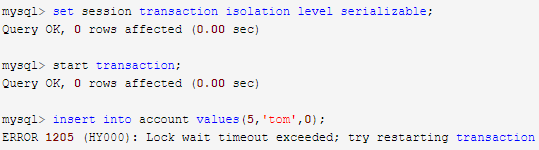 (2)打开一个客户端B,并设置当前事务模式为可串行化(serializable),插入一条记录报错,表被锁了插入失败(因为客户端A的事务还未提交),mysql中事务隔离级别为serializable时会锁表,因此不会出现幻读的情况,这种隔离级别并发性极低,开发中很少会用到。