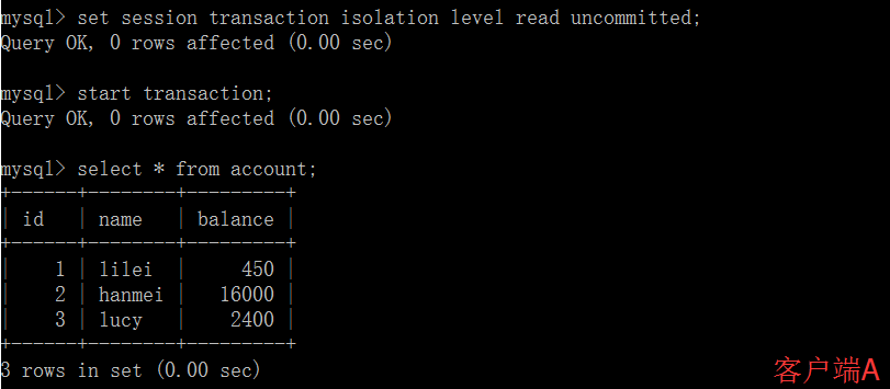(1)打开一个客户端A,并设置当前事务模式为read uncommitted(未提交读),查询表account的初始值: