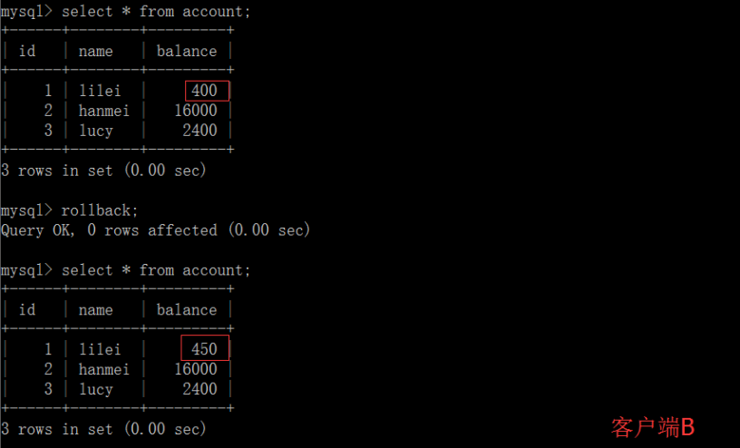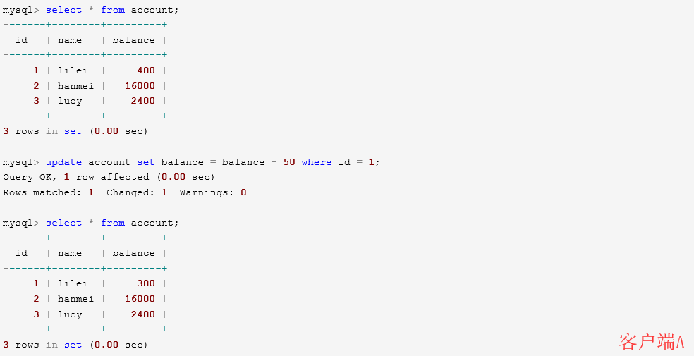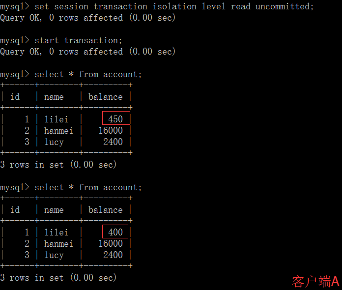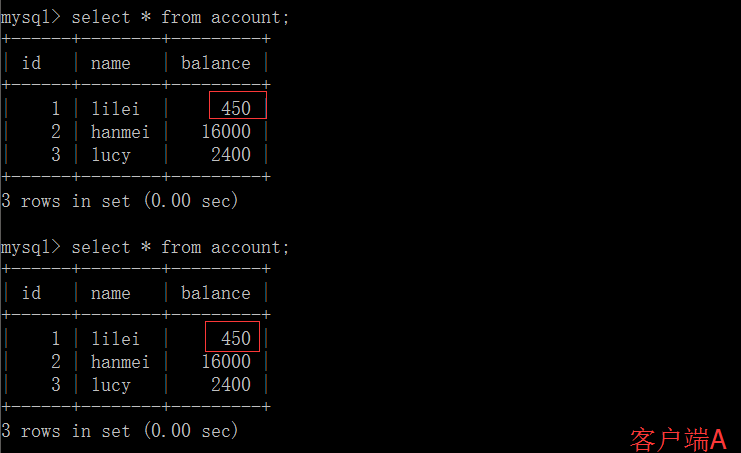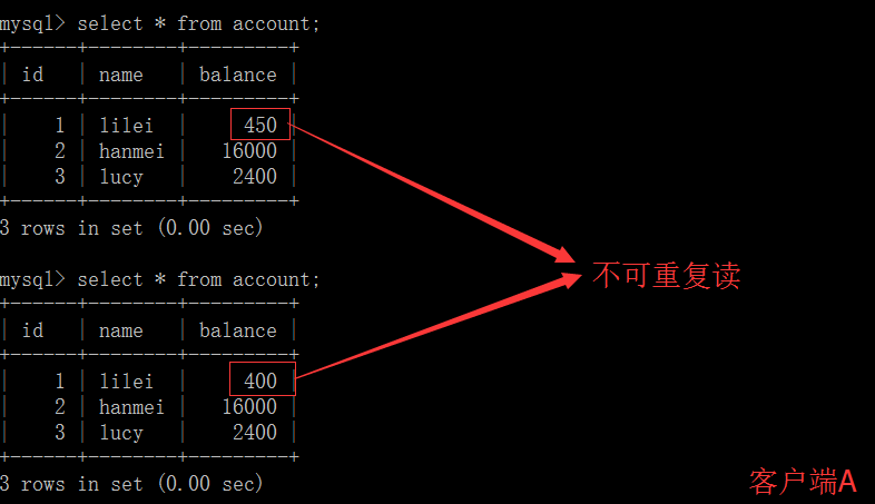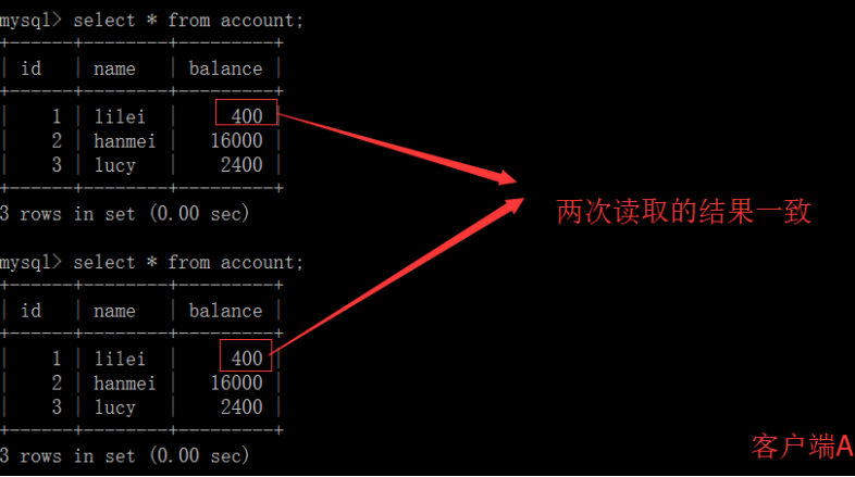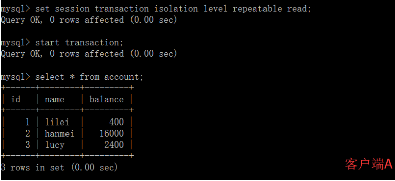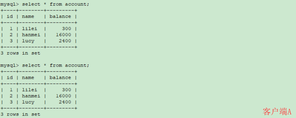 (3)在客户端A查询表account的所有记录,与步骤(1)查询结果一致,没有出现不可重复读的问题