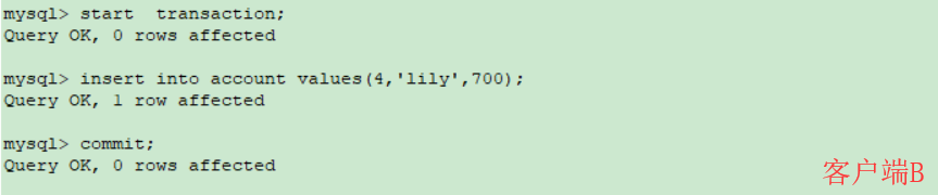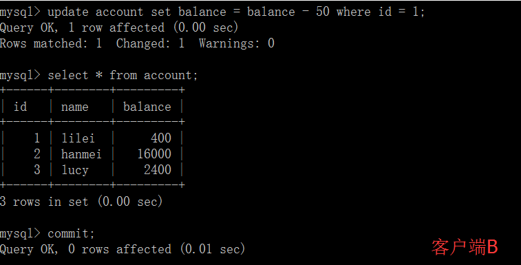 (2)在客户端A的事务提交之前,打开另一个客户端B,更新表account并提交