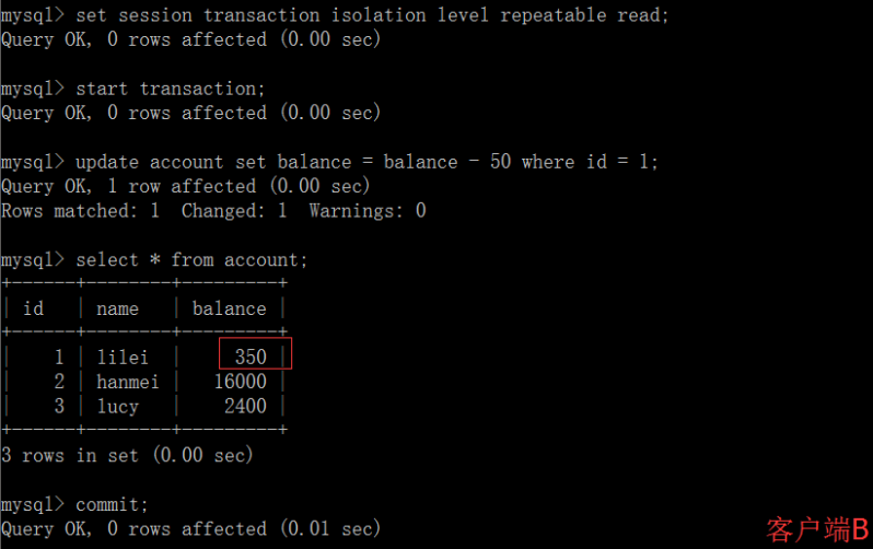 (5)在客户端A执行更新语句update account set balance = balance - 50 where id =1,lilei的balance没有变成350,居然是400,是不是很奇怪,数据不一致啊,如果你这么想就太天真了,在应用程序中,我们会用400-50=350,并不知道其他会话回滚了,要想解决这个问题可以采用读已提交的隔离级别